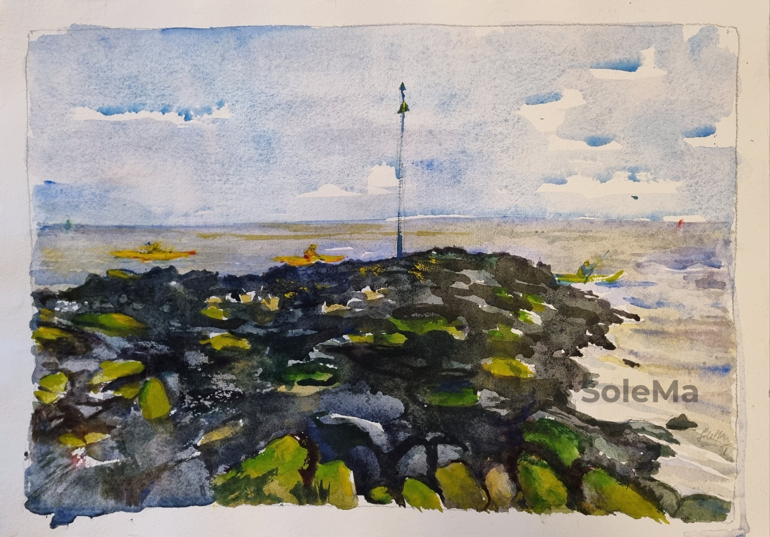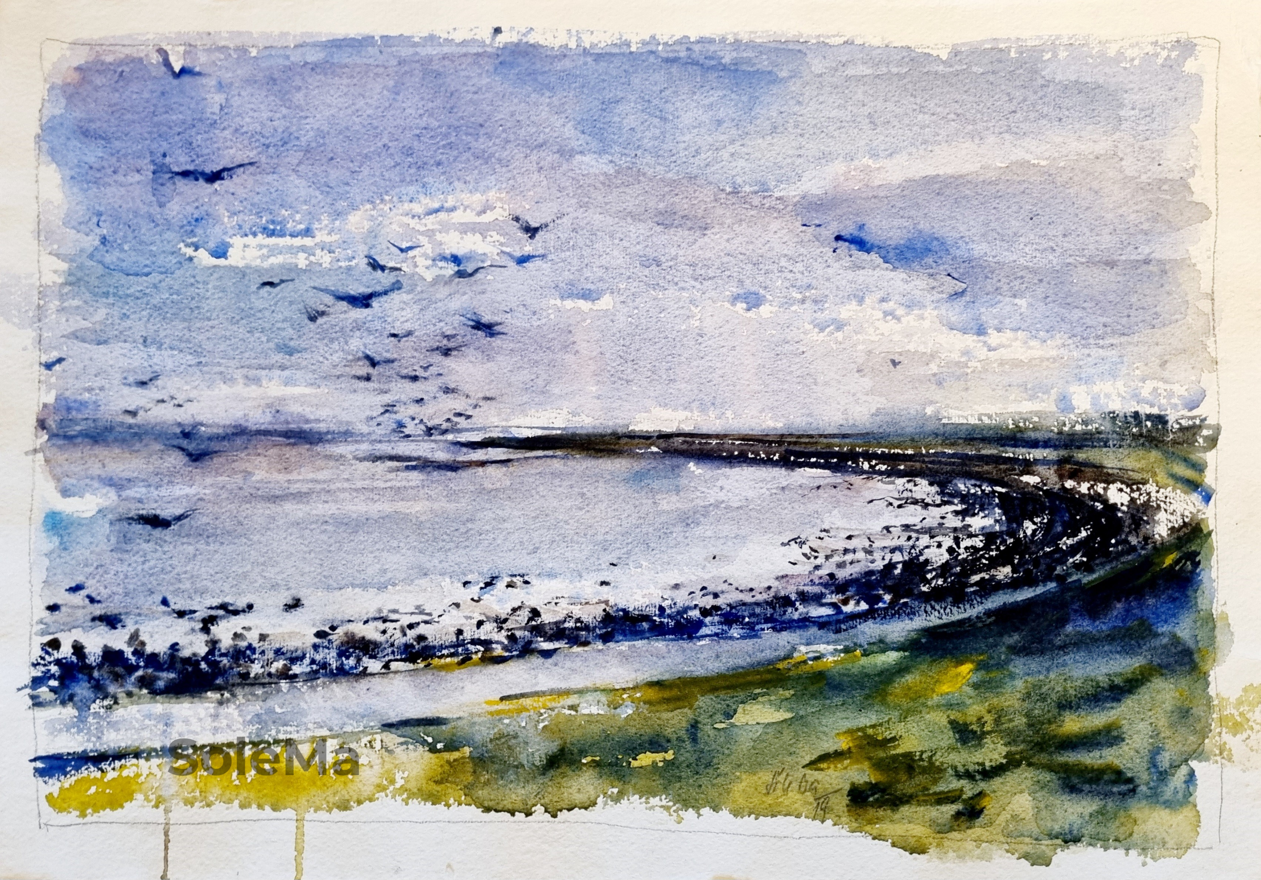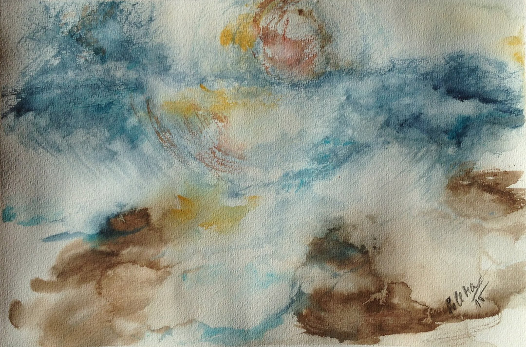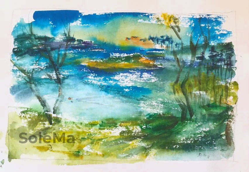 Originalwatercolor and pastel on 300 gsm paper. Paper dimensions: 30 x 40 cm. Artist-quality Winsor and Newton and White Nights watercolors. Note: 3 cm white paper edges got yellow due to a tape glue so passepartout is needed.